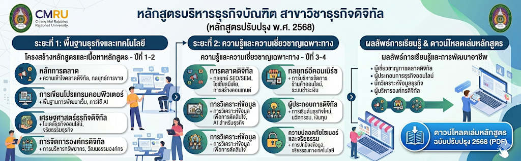 "เจาะลึกโครงสร้างการเรียนการสอน หลักสูตรธุรกิจดิจิทัล (ฉบับปรับปรุง 2568)" มุ่งเน้นการปูพื้นฐานทางธุรกิจควบคู่ไปกับทักษะเทคโนโลยีสมัยใหม่ เพื่อเตรียมความพร้อมสู่การเป็นมืออาชีพในอุตสาหกรรมดิจิทัล